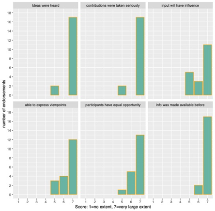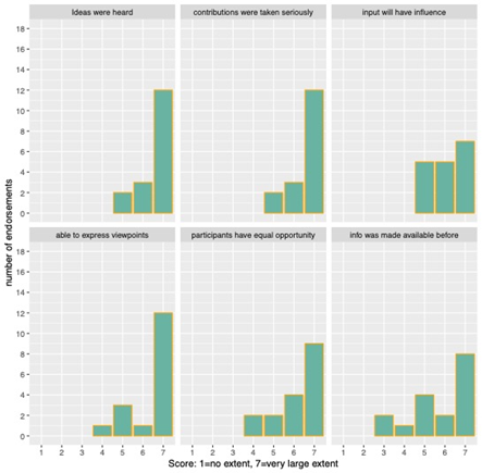 - A comparison of PEET results from the start of the project in November 2023 (top) to those collected at the end in May 2025 (bottom) revealed a consistently strong and steadily improving level of engagement. Notable gains were observed in areas such as participants feeling their ideas were heard, having equal opportunity to contribute, and receiving relevant information before meetings.